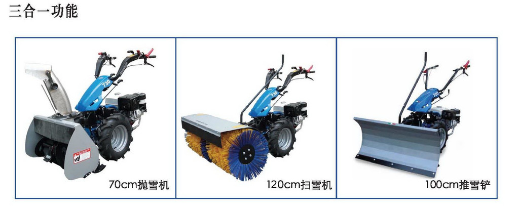 7.通用性,機器可以一機多用,即:一臺主機可以更換掃雪滾刷、除草、旋耕、開溝、雪鏟、拋雪等數(shù)十種以上的輔具頭。