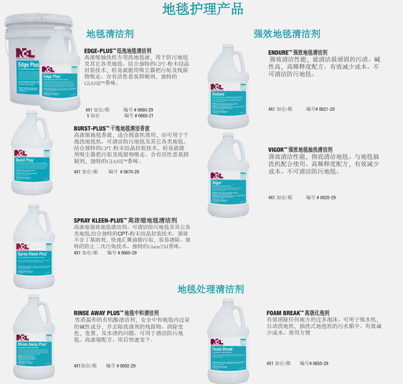 由NCL提供成熟配方產(chǎn)品的地毯護理解決方案,可以延長地毯的使用壽命,維護地毯的靚麗色彩,提供使用者滿意的環(huán)境氛圍和舒適度。NCL提供的全方面的地毯護理產(chǎn)品包括清潔劑、除漬劑、地毯防護劑及其它的配套產(chǎn)品,讓使用者在維護地毯時可以輕易的使用產(chǎn)品,并有效控制成本。特別是我們的ECT™和EPT™粉末結晶封裝技術的防再次污染配方的地毯清潔劑將污垢包裹成一個松脆的、不粘的粉末殘渣,通過常規(guī)的真空吸塵器很容易去除。使地毯更加美麗干凈。其結果是延長了地毯清洗間隔時間,延長了地毯保持干凈的時間。